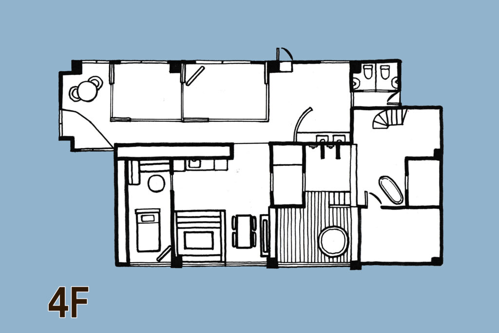 なんと4階フロアをマルっとお部屋にしました。ここにしかない絶景を味わうお部屋になります。海に面したフロア、朝日を感じる寝室、変わり囲炉裏処、海が見える絶景ジャグジー内風呂&本格サウナ、屋上ジャグジースパ、山側には和室(20畳)が。ファミリーやグループで貸し切って、波津海岸を一望できる贅沢なひと時をお過ごしください。